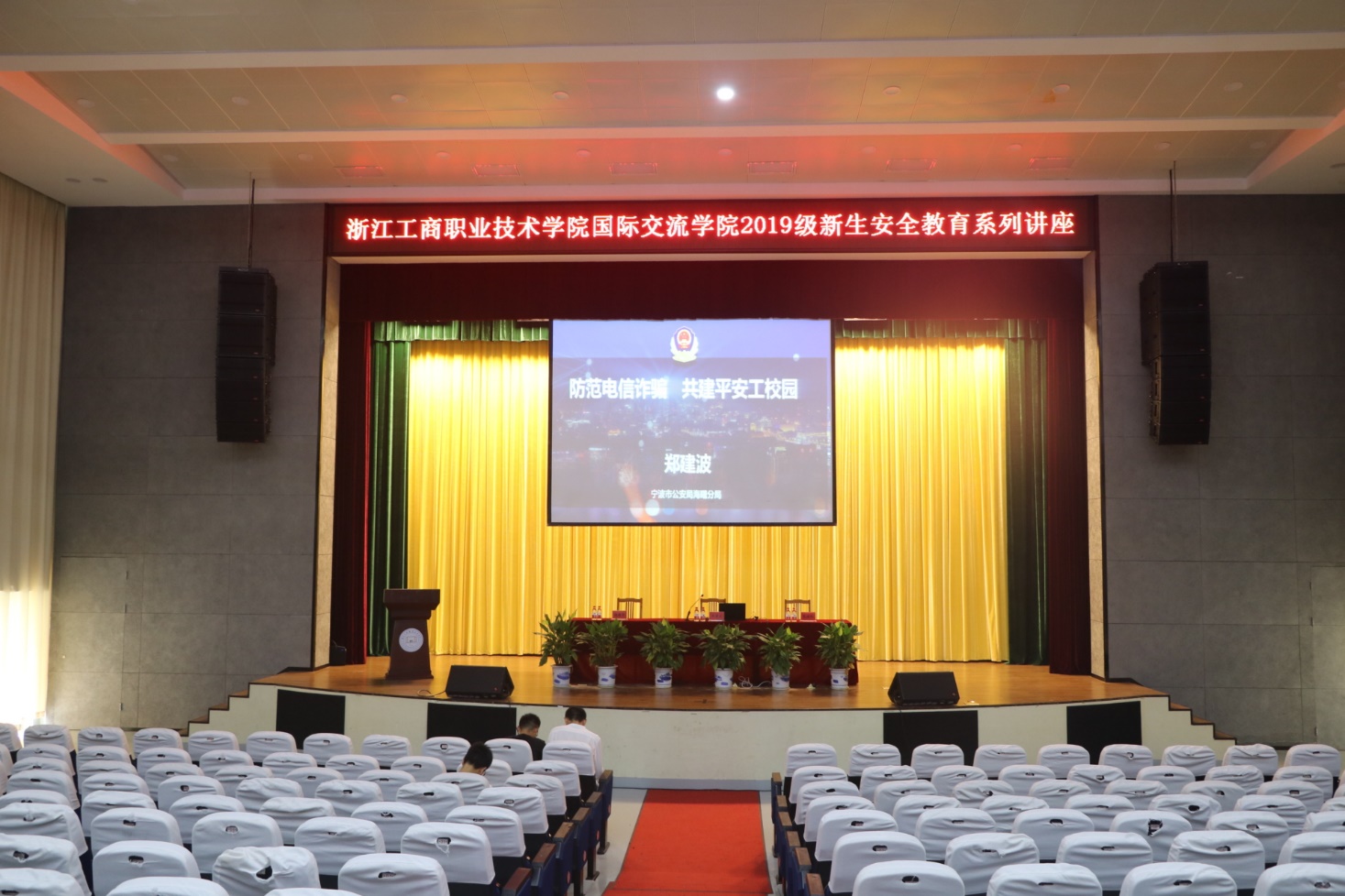 为提升学生安全防范和自我保护意识,培养学生良好的生活、行为习惯,共同创建安全、文明、和谐的校园环境,9月26日浙江工商职业技术学院国际交流学院联合海曙区反诈中心在博学楼报告厅举行了国际交流学院2019级新生安全教育系列讲座。宁波市海曙区反诈中心郑警官、浙江工商职业技术学院学生处副处长包倍红、浙江工商职业技术学院国际交流学院副书记赵进军出席并分别为新生讲解了大学生防诈防骗等安全意识。