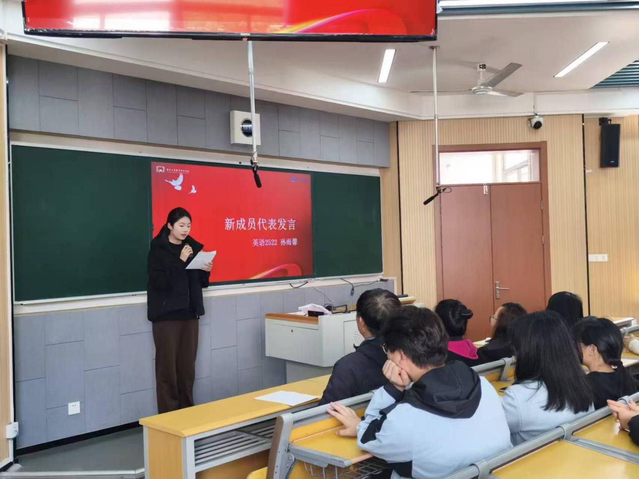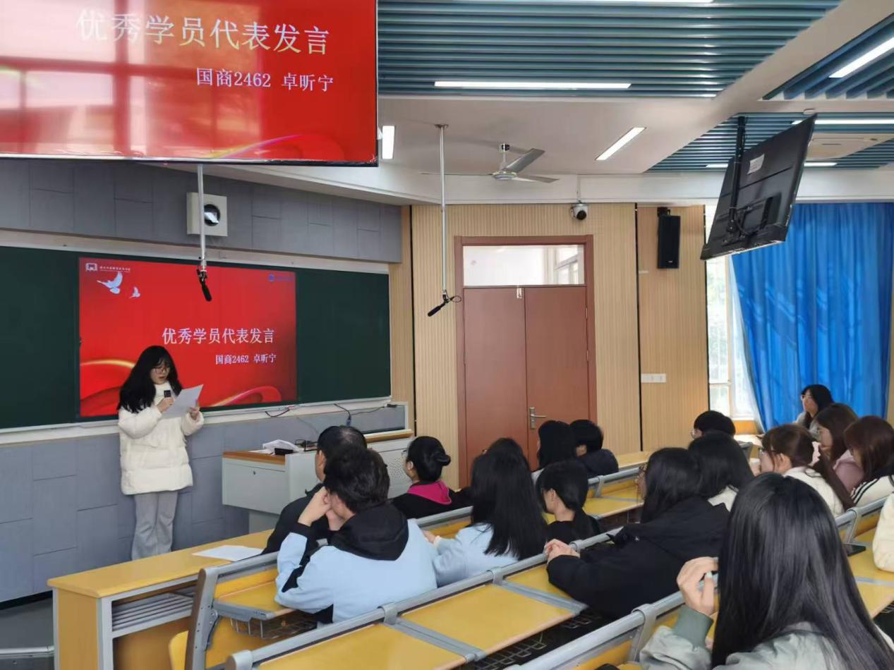 国商2462班卓昕宁作为第一期优秀学员代表发言,分享了党校学习的收获与感悟,畅谈思想认识和政治觉悟的提升;英语2522班孙雨馨作为本期新学员代表发言,表达了认真参加党校学习、积极向党组织靠拢的决心。