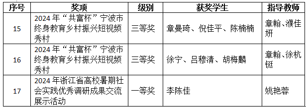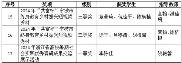 创建双师培育基地 6 个;获得浙江省微课大赛二等奖 1 项;浙江省高职院校教学能力比赛二等奖 1 项;宁波市第二届高校教师课程教学创新能力比赛二等奖 1 项;获得第一届、第二届、第三届全国跨境电商专业教师实践教学能力竞赛二等奖 3 项,一等奖 1 项,三等奖 1 项。教师获澳大利亚霍姆斯格兰学院最佳海外教师“金、银、铜”奖各1项;1人入选宁波市领军和拔尖人才工程、1人入选宁波市哲学社会科学学科带头人、1人入选浙江省高职高专专业带头人、1人为校教学名师、3人为校教坛新秀;名师名匠结对项目完成验收 1 项,立项 1 项;“宁波青年工匠”培养项目 1 项;高级人才 1 项。