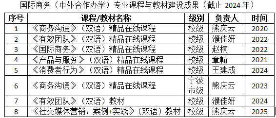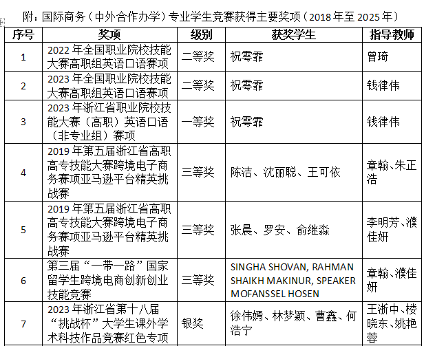国际商务(中外合作办学)专业培养能够践行社会主义核心价值观,传承技能文明,德智体美劳全面发展,具有一定的科学文化水平,良好的人文素养、科学素养、数字素养、职业道德、创新意识,爱岗敬业的职业精神和精益求精的工匠精神,较强的就业创业能力和可持续发展能力,掌握本专业知识和技术技能,具备职业综合素质和行动能力,面向批发业、零售业和商务服务业中的国际市场采购专员、国际市场营销推广专员、国际市场销售专员、跨境电商营销专员、国际商务专员等岗位,能够从事国际市场调研与分析、国际市场营销、国际市场销售、国际商务合作、国际商务服务等工作,具有较强可持续发展能力的高技能人才。近5年来,国际商务(中外合作办学)专业学生先后获得国家级竞赛奖项2项、省级竞赛奖项10项、市级竞赛奖项30项。国际商务(中外合作办学)专业每年招生人数90人。毕业生去向落实率99%以上,就业对口率99%以上,留甬率80%以上,升本率45%以上。